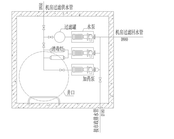 流程一:泳池回水——消毒器水泵——紫外線消毒器——泳池給水。該流程除過濾及沉淀吸污時關閉外,要不間斷運行。水泵及紫外線燈應有一套備用,損壞后應立即更換。
