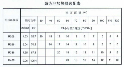 如果你的游泳池還沒有選配加熱器,請先確認你游泳池的規格并計算出池面面積,根據池面面積和你的溫升要求,查下表即可確定加熱器的規格。