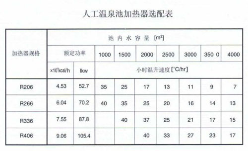 如果你的溫泉池規格比表格所列規格大,可選用商用P型加熱器或多臺并用,可向鄭州泳潔專家咨詢。
