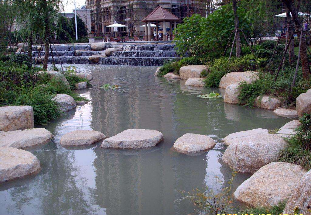如果在水池施工中有一點點的疏漏,所有的工作都要前功盡棄,所以在景觀工程水池施工的每一道工序完成后,都要進行跟蹤檢查,記得有一次在檢查過程中發現砼底板有一小塊區域出現了微小的裂縫,雖然對水池影響甚微,但為了確保萬無一失,不留隱患。我們仍堅持進行整改,派人順著裂縫的方向開鑿(鑿1cm寬的槽),然后用清水沖洗干凈后,再用膨脹水泥砂漿進行灌封壓干,保證了水池長久不滲漏。