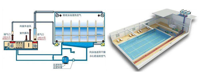 三集一體除濕熱泵系統的設計理念,即基于能源再生與環保的概念,把蒸發到空氣中的暖濕氣體通過風管引入到除濕熱泵中加以回收利用,再將經過處理的干熱空氣通過風管輸送到泳池室內。這樣,一方面通過熱泵內部的蒸發器,使暖濕氣體中冷凝出冷凝水,既干燥空氣達到除濕的效果又可以回收蒸發掉的水分至泳池,減少泳池補充水試游泳池在運行過程中節約大量的成本。