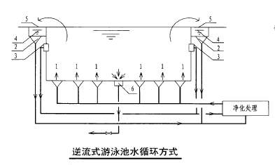 逆流式循環(huán)即泳池內(nèi)的全部循環(huán)水量經(jīng)設在池底的給水口或給水槽送入池內(nèi),再經(jīng)設在池壁的溢水槽取回使用過的相應體積的水,進行凈化(加藥、過濾、加熱及消毒)后再送回池內(nèi)繼續(xù)使用的水流方式。