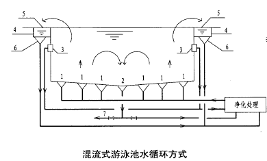 混合流式循環(huán)即泳池內(nèi)60%-70%的循環(huán)水量經(jīng)池壁外側的溢水回水槽取回,另外30%-40%的水量,經(jīng)設在池底的回水口取出,將這兩部分循環(huán)水量合并進行凈化(加藥、過濾、加熱及消毒)后再送回池內(nèi)繼續(xù)使用的水流方式。