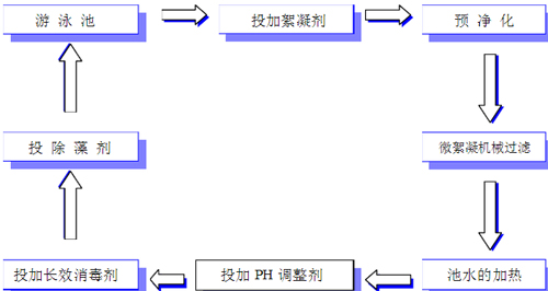 為了滿足人們對游泳池水質越來越高的要求和人們對水質在視覺、嗅覺上的愿望,結合我公司多年來在全國上百個工程實踐中所總結出的成功經驗,我公司在游泳池水處理系統工藝流程中分為六大部分七大程序。六大部分分別為池水的循環、池水的凈化、池水加藥和水質平衡、池水消毒、池水的加熱、水質監測和系統控制:七大程序分別為絮凝劑的投加、池水的凈化、池水的微絮凝機械過濾、池水的PH值調整、池水的長效氯消毒、池水的除藻。