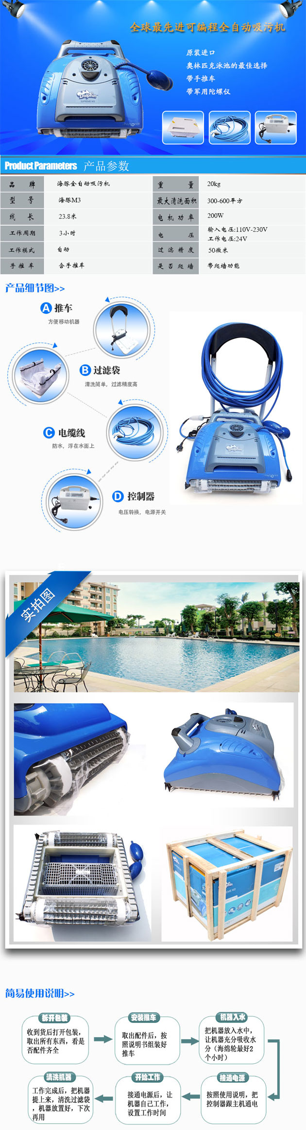 •   海豚M3全自動泳池吸污機能夠給你提供一個數小時干凈、清澈、衛生的泳池享受。